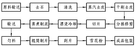 将制好的薯泥通过泵送至辊筒干燥机上进行干燥,其水分控制在%10以下。之后通过刮刀机构将干燥后的大片状物料刮下,并通过破碎过筛制成2~8毫米的雪花粉。